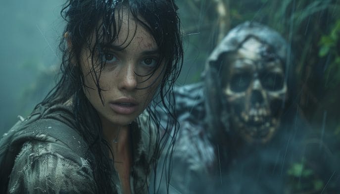 Wo war ich nun? Sollte ich zurück? … hm … gerade als ich aufstand erstarrte ich. Auf der Lichtung, vielleicht 8 Meter von mir entfernt, stand jemand. Es war eine Frau und ihre langen, ungepflegten, zerzausten schwarzen Haare wehten im Wind der urplötzlich aufkam.