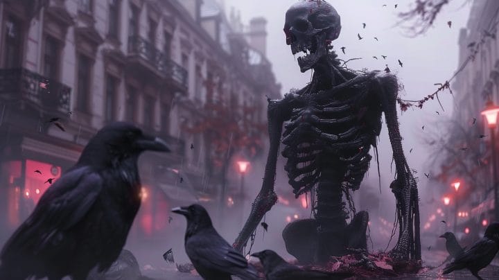 Er hob seinen Kopf, den er bislang gesenkt gehalten hatte, und blickte zu ihnen hinauf. Schwarze Augenhöhlen wandten sich gen Himmel, als sich sein schmales, langes und hageres Gesicht langsam nach oben drehte und die Krähen mit einem lauten Aufkreischen tot zu Boden fielen.