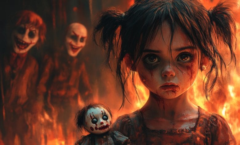 dass das Mädchen eine Clownspuppe ohne Augen in der Hand hielt, dessen Mund immer größer wurde und anfing, hysterisch zu lachen.