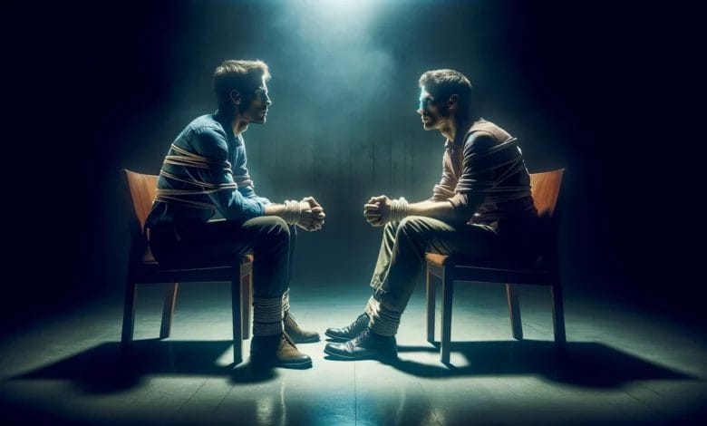 „Nein! Ich bin schlafen gegangen und aufgewacht, gefesselt auf einem beschissenem Stuhl mit irgendeinem Arschloch vor mir, der in genau derselben beschissenen Situation ist wie ich. “